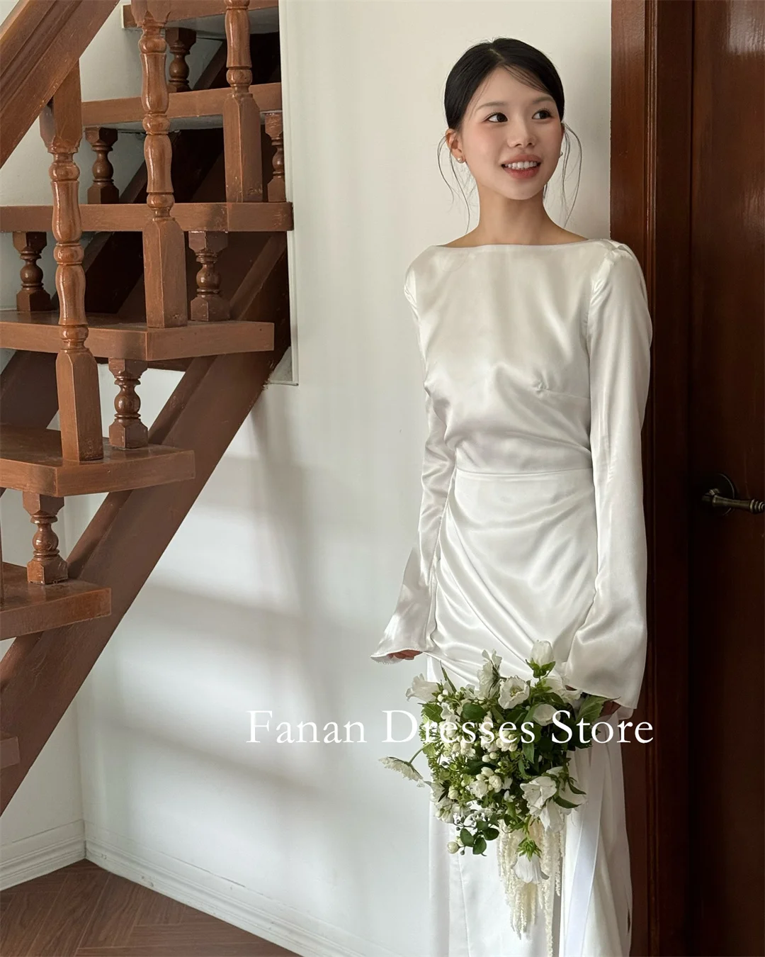 FANAN 보트 넥 한국 칼집 웨딩 드레스 웨딩 드레스 실크 새틴 아이보리 긴 소매 맞춤형 예쁜 신부 가운 플러스 사이즈