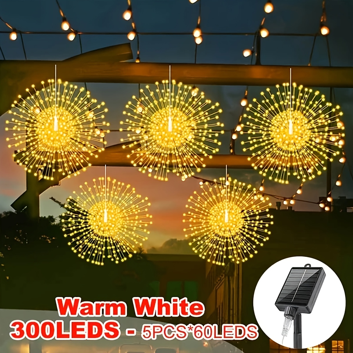TEMU 300 LED 행잉 볼 라이트 5/4개입, 스타버스트 라이트, 240 LED 태양광 행잉 플라워 라이트, IP65 실외 LED 조명, 실내외 웨딩 크리스마스 장식 불꽃놀이 라이트, 캠핑, 파티오, 정원, 차양, 수영장에 적합.