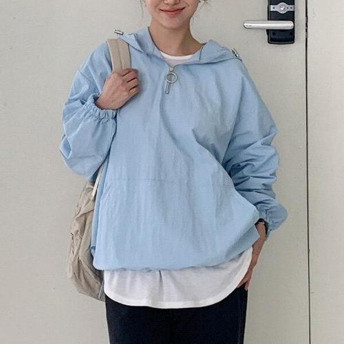 브랜드 퀄리티 고밀도 나일론 경량 바스락 반집업 오버핏 후드아노락 바람막이