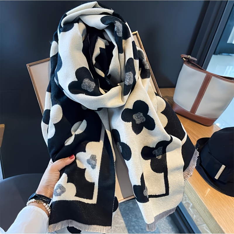 TEMU 여성용 양면 플로럴 스카프 - 두꺼운 따뜻한 겨울 목도리, 우아한 블랙 & 화이트 꽃무늬 패턴, 비신축성 우아한 샤울, 가을/겨울 캐주얼 및 정장용 - 세련된 추위 날씨 액세서리, 계절 패션, 클래식 디자인, 부드러운 질감, 스타일리시 랩, 패션 애호가, 가을 패션, 자카드 직조, 여성용 우아한 스카프/샤울, 여름 컬러 소프트 스카프