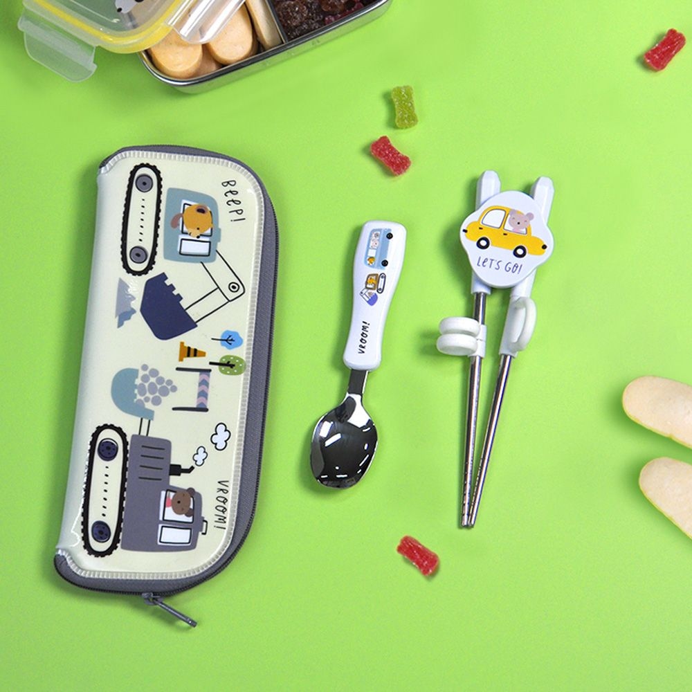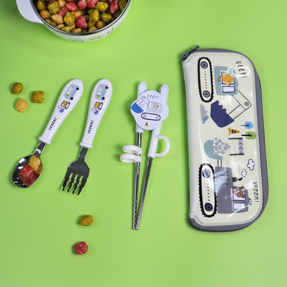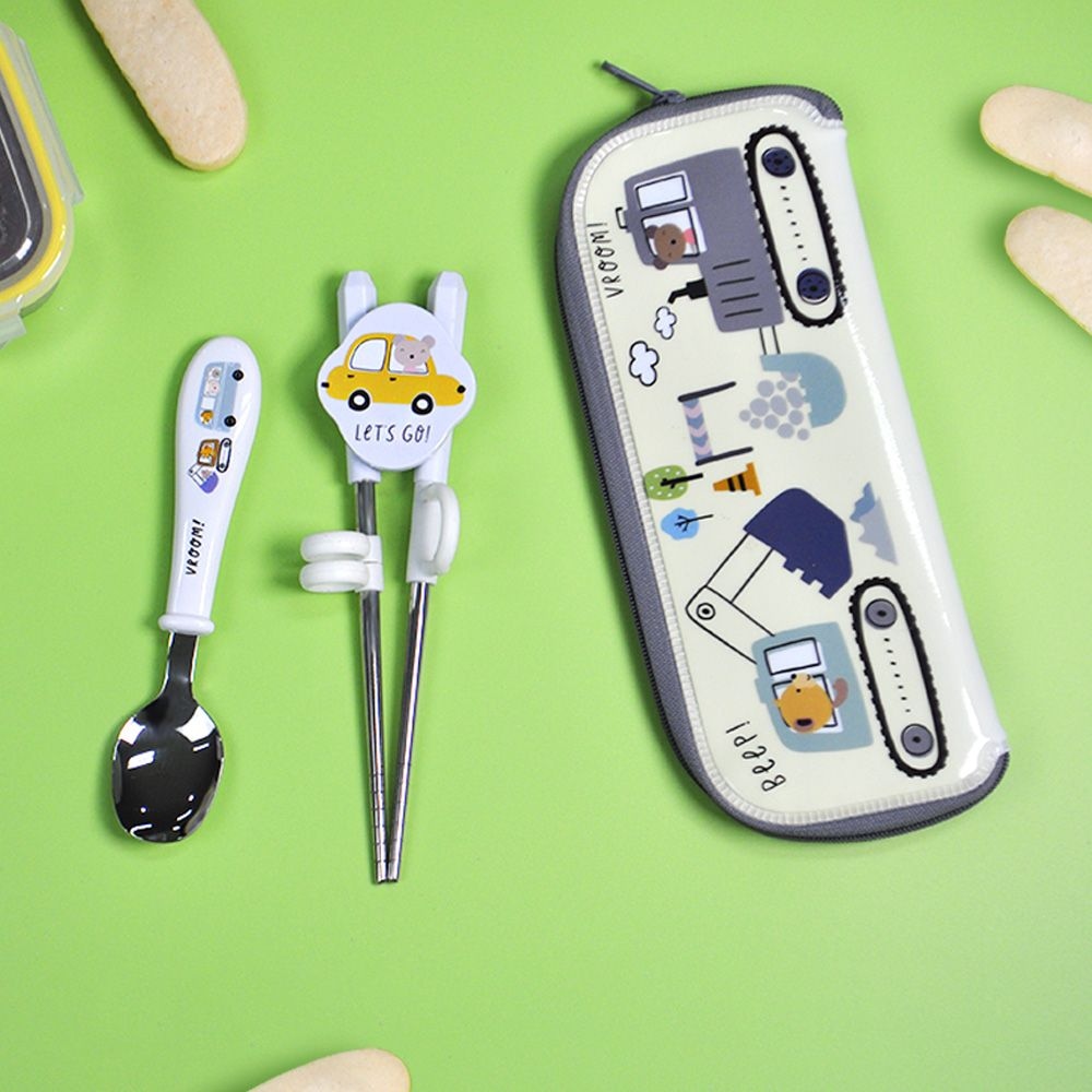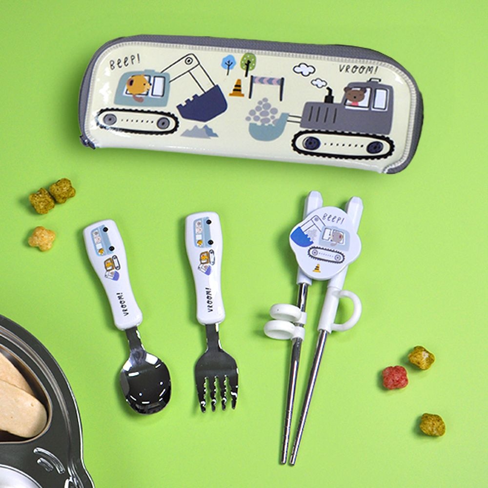 키즈부릉 포크레인 꼬마 스텐 스푼포크 젓가락 수저케이스 세트 국산 유아 숟가락 연습젓가락