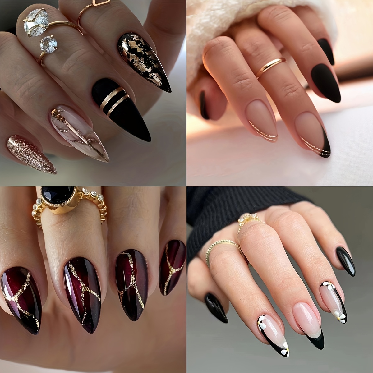 TEMU 가을 겨울용 프레스온 네일 4개 세트 (96개), 골드 글리터 디자인 혼합 레드 브라운 그라데이션 미디움 아몬드형 접착식 손톱 + 네일 파일 포함 여성용
