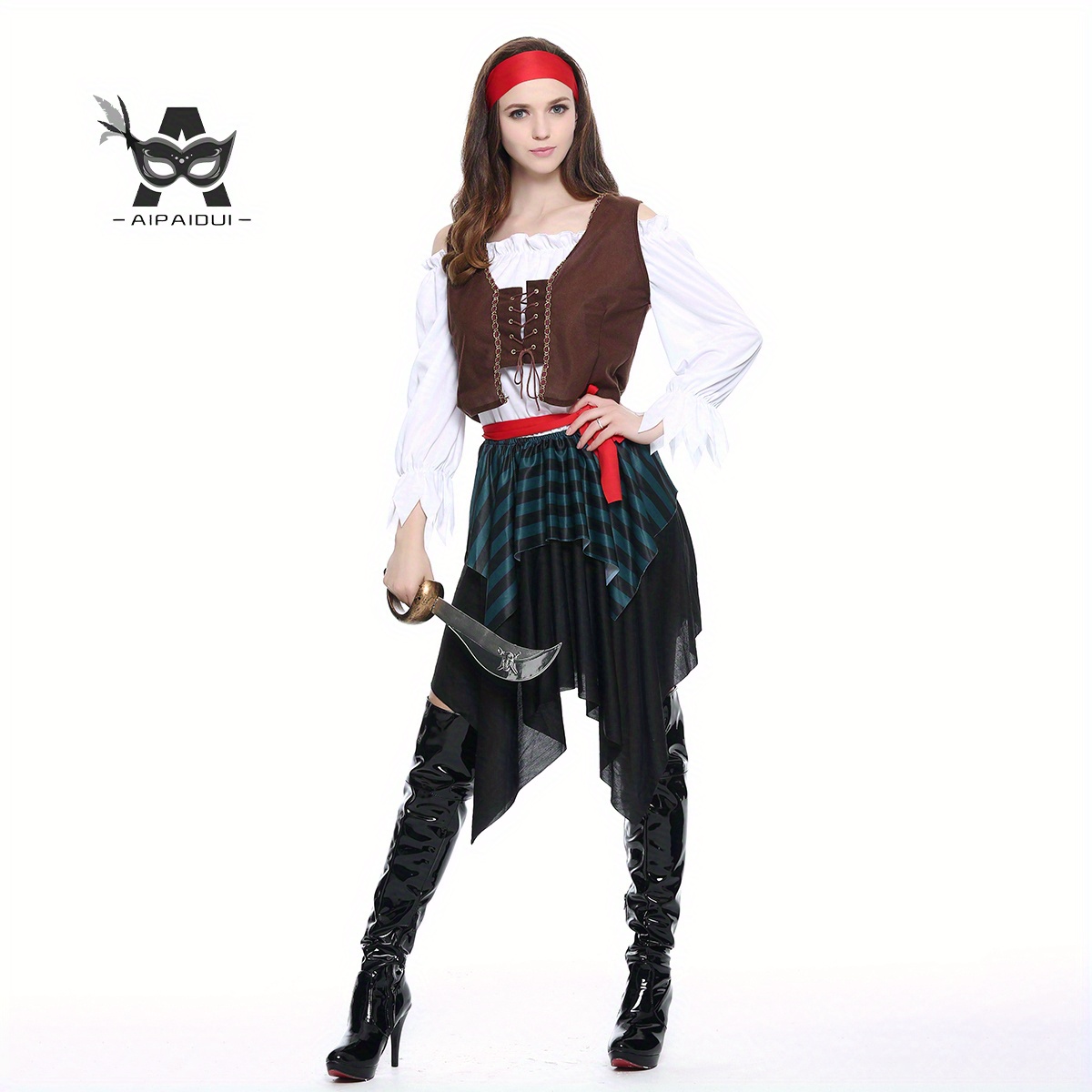 TEMU 5pcs 여성 카리비안 해적 의상 세트는 조끼 + 헤드밴드 + 벨트 + 스커트 + 화이트 탑을 포함합니다. 할로윈 해적 스타일, 역할 놀이, 파티, 카리비안 해적, 카니발, 카니발 클래식 스타일, 할로윈 여성 의상에 완벽합니다.
