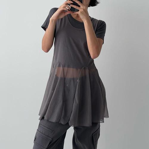 [다잇템]여자 크롭반팔 비침 롱나시 발레코어룩 세트