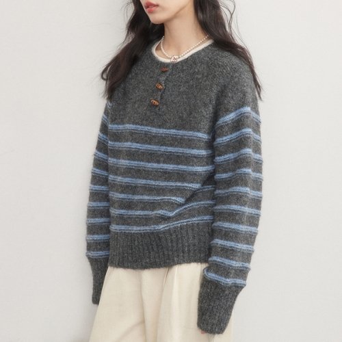 (복슬복슬/겨울니트) 배색 스트라이프 카라넥 버튼 긴팔 니트 데일리룩 데이트룩 나들