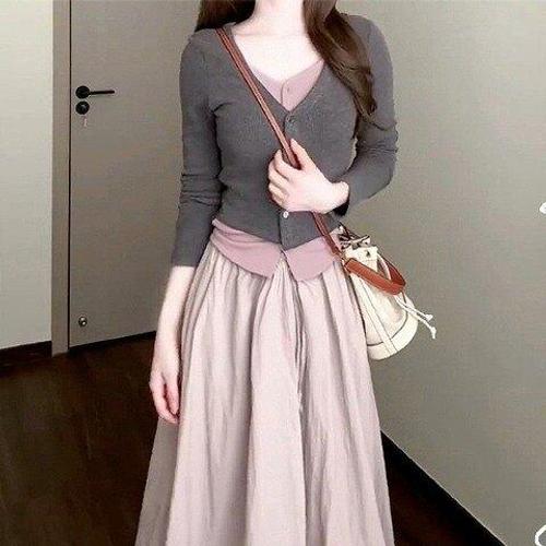 [아리엘스타일]브이넥가디건 롱스커트 데일리룩 사라엘투피스