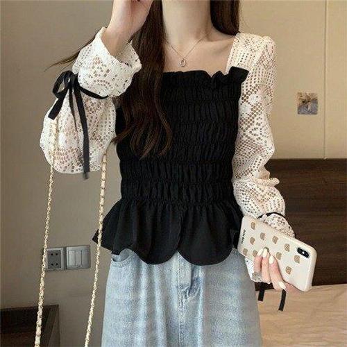 [아리엘스타일]셔링 스퀘어넥 펀칭레이스 에이레블라우스