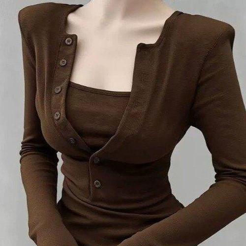 [아리엘스타일]레이어드슬림티 버튼넥라인 여리핏탑 비오비레이어드