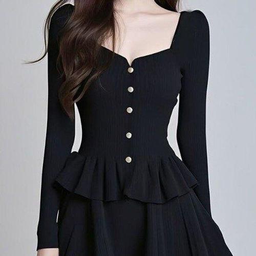 [아리엘스타일]스퀘어넥원피스 골드버튼플레어 슬림라인룩 슐라이프
