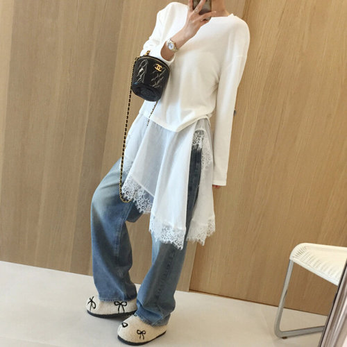 아이미마인 / 홀릭 언발 시스루 자수 레이스 롱 긴팔 레이어드 니트지 티셔츠 (2color)
