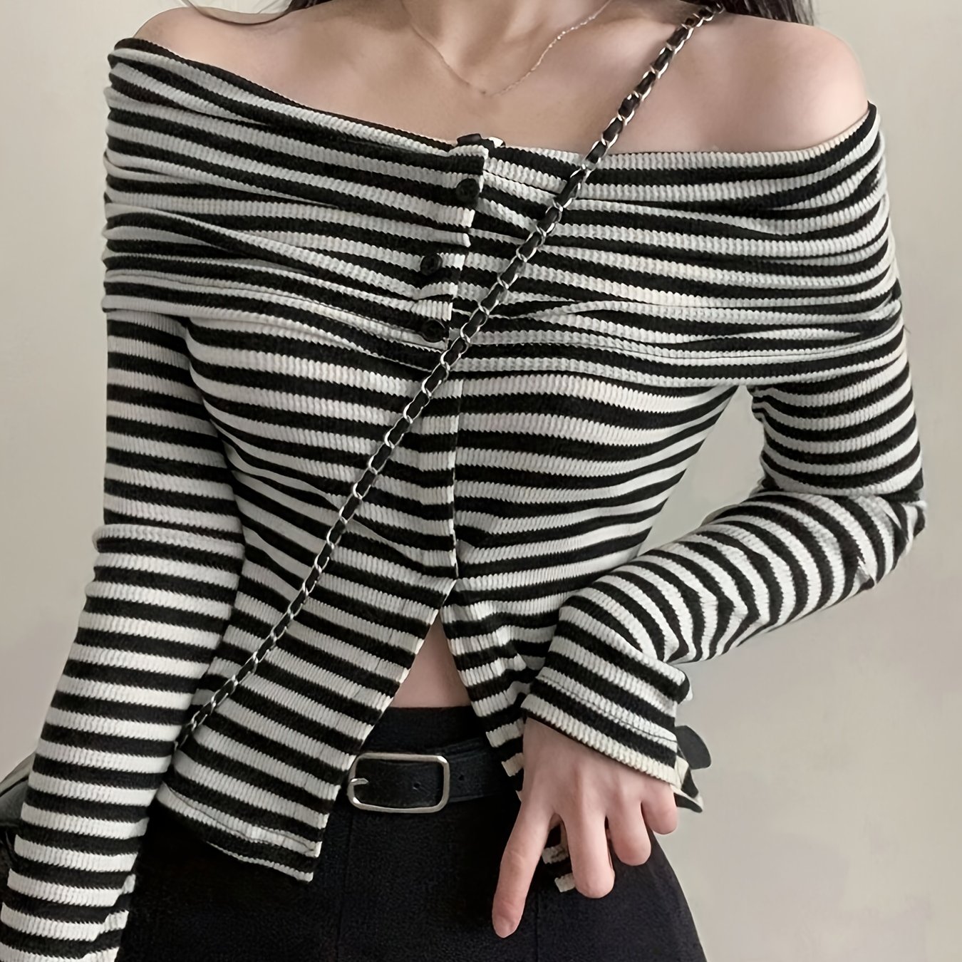 TEMU 여성 오프숄더 긴팔 티셔츠 - 슬림핏, 세로 , 봄/가을 캐주얼 시크 탑, 캐주얼 복장에 완벽, 봄 패션 탑 | 오프숄더 패션 | 스타일리시