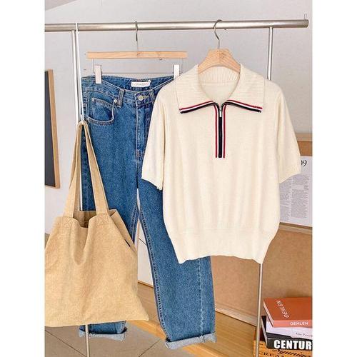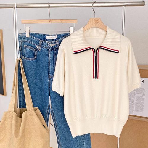 [샵앤]여성 카라넥 배색 반집업 반팔 니트티 DGB-WKN-4730-아이보리
