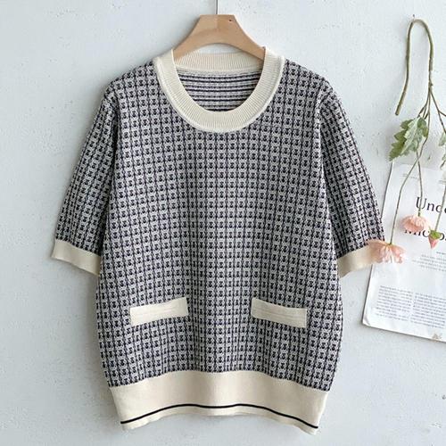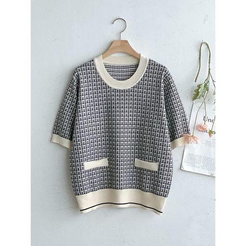[샵앤]배색 라운드 여성 골지 반팔 니트 티셔츠 BONG-WKN-3116-아이보리