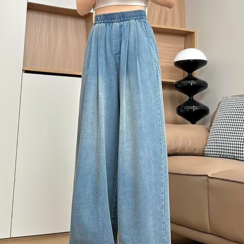 여성용 아이스 실크 스트레치 청바지 여름용 시원한 착용감의 하이웨이스트 슬리밍 팬츠 플러스 사이즈 와이드핏 데일리 팬츠로 편안한 외출과 여행에 적합한 스타일리시한 선택