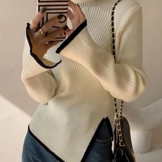 오빵 여성용 터틀넥 목폴라 겨울 루즈핏 소매배색 니트티 루즈핏 스웨터 폴라니트