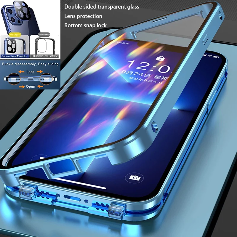 360 ° 전체 보호 금속 자기 양면 유리 잠금 버클 전화 케이스 iPhone 16 Pro Max 14 12 13 11 15 Pro Max Cover