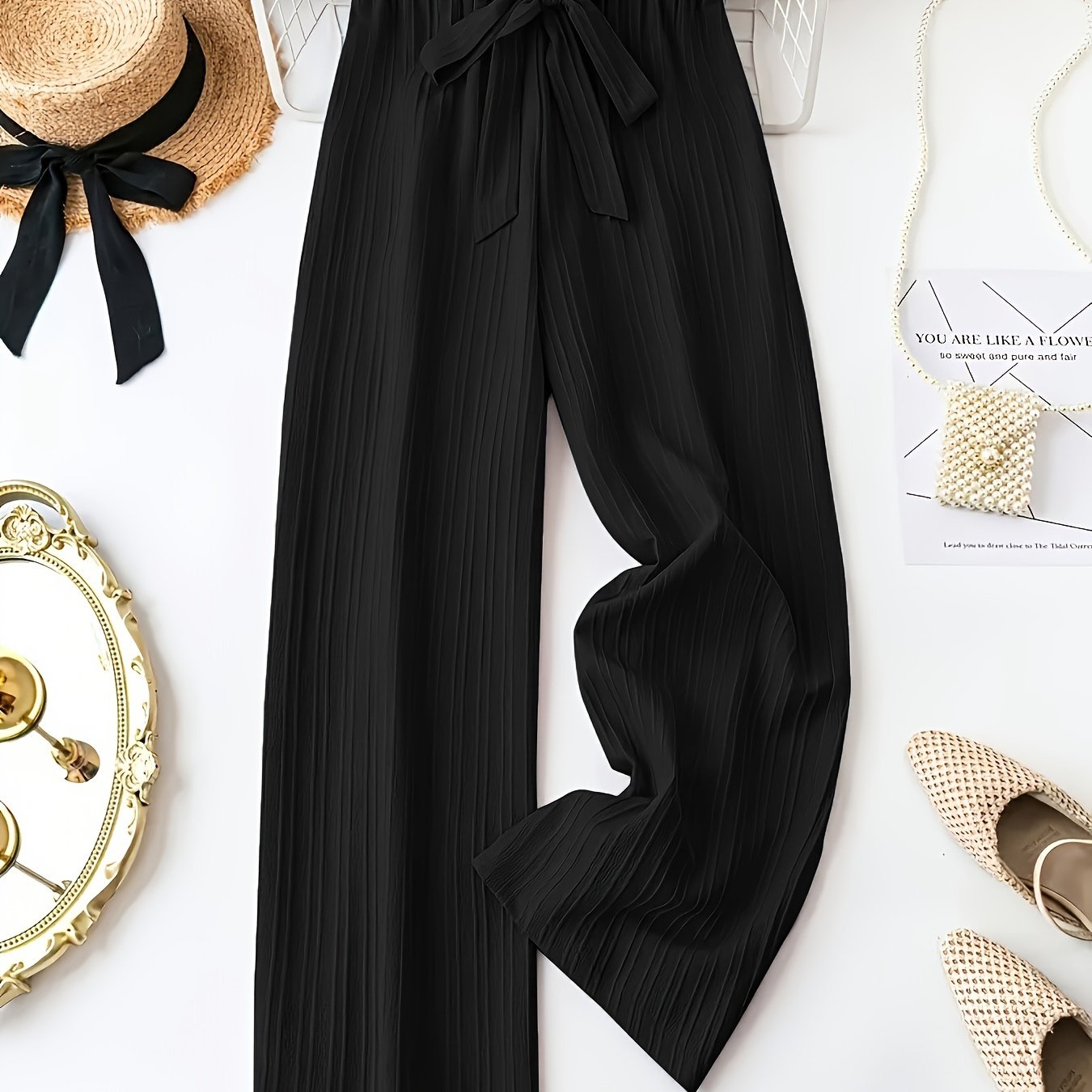 TEMU 여성용 시크한 와이드 레그 팬츠 - 캐주얼 솔리드 컬러와 리본 디테일, 신축성 없는 폴리에스터, 세탁기 사용 가능 - 사계절 내내 완벽함