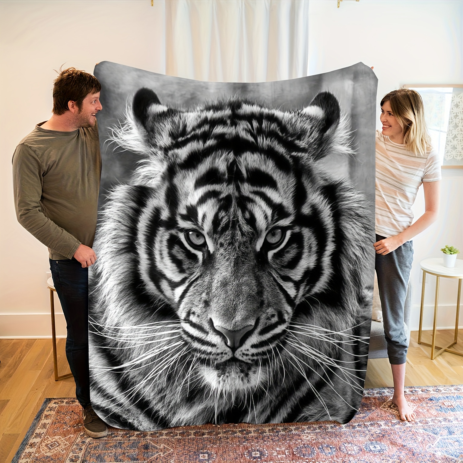 TEMU 1pc 대단한 흑백 호랑이 프린트 플란넬 스로우 블랑켓 - 모든 계절에 부드럽고 따뜻하며 다용도로 사용할 수 있는 완벽한 소파, 침대, 사무실, 여행용 블랑켓, 가족 및 친구에게 이상적인 휴일 및 생일 선물, 올시즌 스로우|스타일리시한 동물 프린트|기계 세척 가능한 커버, 호랑이 장식|쇼파커버|쇼파침대