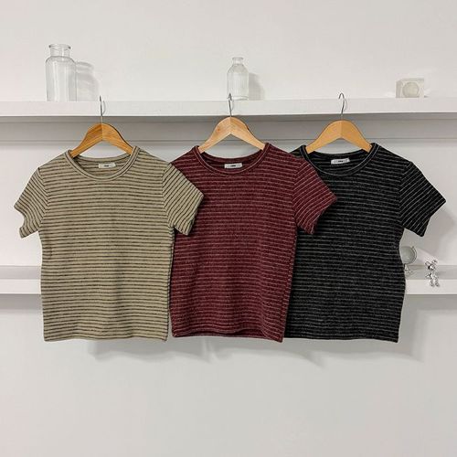 [미라클세븐]여성 앙고라 겨울 크롭 반팔 티셔츠 스트라이프 라운드넥