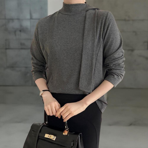 [옷자락] 여자 앙고라 롱타이 목폴라 절개 긴팔 출근룩 블라우스