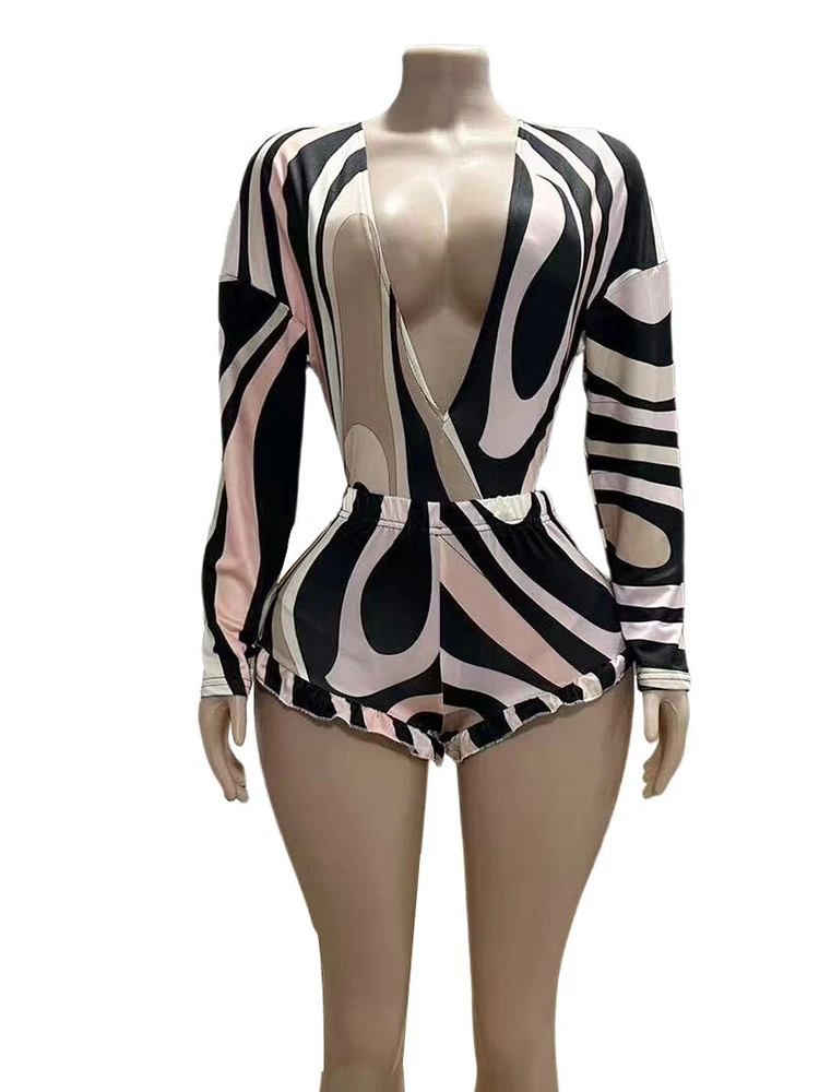 이상한 Puss 다채로운 인쇄 여성 2 조각 세트 깊은 v 넥 전체 슬리브 바디 슈트 + 메쉬 반바지 일치하는 streetwear 섹시한 Hipster 정장