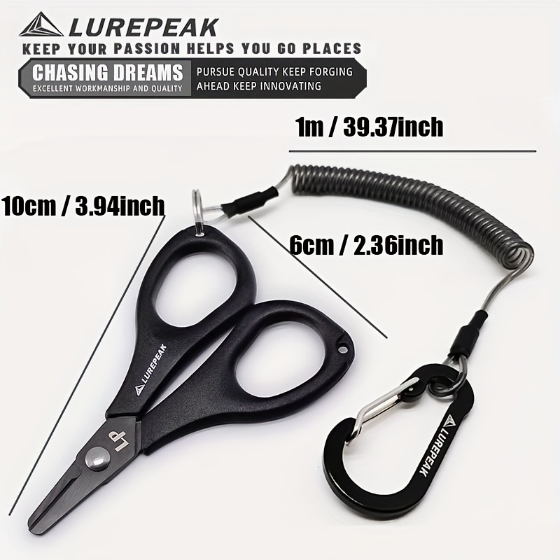 TEMU 1세트 티타늄 코팅 낚시선 가위 및 탄성 로프 세트, 톱니형 가위, 미끄럼 방지 PP 손잡이, 휴대용 고출력 PE 가위, 야외 낚시에 적합, 블랙 & 레드 색상, 분실 방지를 위한 탄성 강철 와이어 코어 로프 포함