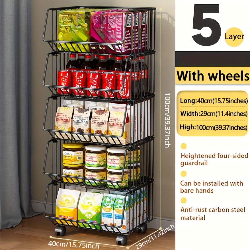 TEMU 5단 스택 가능 이동식 캐리어 - 주방, 욕실, 세탁실 및 거실용 헤비듀티 금속 정리대 - 블랙 다목적 카트, 쉬운 조립, 다양한 선반 디자인, 견고한 보관 솔루션, 공간 절약형, 내구성 강화, 바쁜 가정용 멀티툴러티 랙