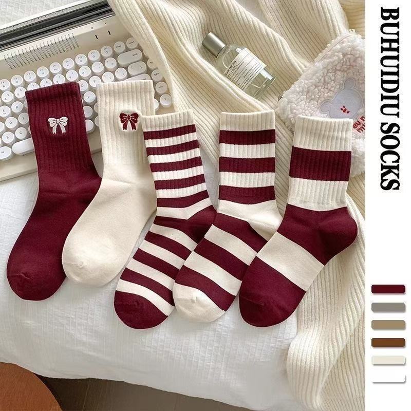 TEMU 혼합 5 쌍, 안콜레 레드 필 스타킹, 보우넛 미드 튜브 스타킹, 새해 분위기, 가을과 겨울 따뜻한 패션 여성 스타일