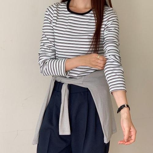 [다잇템][다잇템] 여자 편한 줄무늬 베이직핏 링거넥 콘트라스트 양기모 티셔츠_23387288_588872
