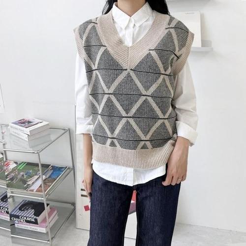 [신상오픈런]|KMJ44B6|러만제 여성 유니크 체크 스웨터 패턴 V넥 양모 조끼_18177018_597559
