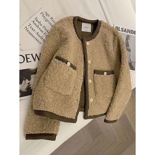 여성 캐주얼 배색 노카라 뽀글이 양털 루즈핏 가디건