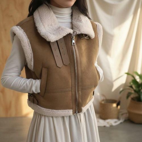 [다잇템]여자 클래식 코디 무스탕 폴라넥 양털 베스트