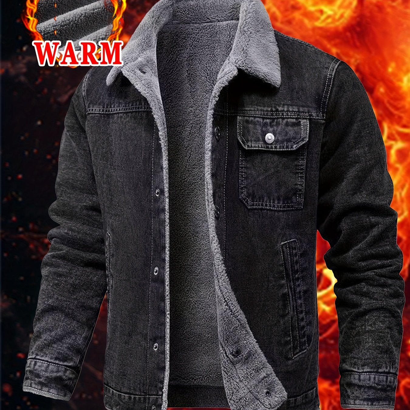 TEMU 남성용 기모 안감 두꺼운 인조 데님 재킷 | 양모 벨벳 칼라로 겨울철 따뜻함, 가을/겨울용 캐주얼 긴소매 야구 재킷