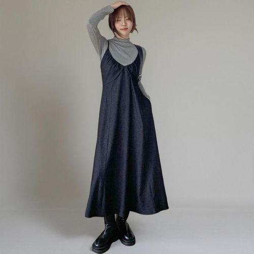 [옷자락]여성 폴라넥 긴팔티 레이어드 어깨끈 롱 원피스 세트