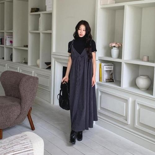 [옷자락]여성 폴라긴팔티와 어깨끈 롱 원피스 세트