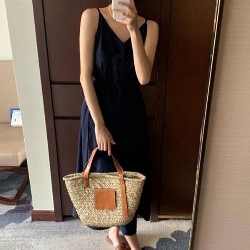 [옷자락] 여자 브이넥 허리스트랩 A라인 어깨끈 롱 원피스