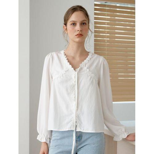 [미니멈에브리데이][미니멈에브리데이] 프릴 V넥 리본 긴팔 블라우스 (EC1BA016D)