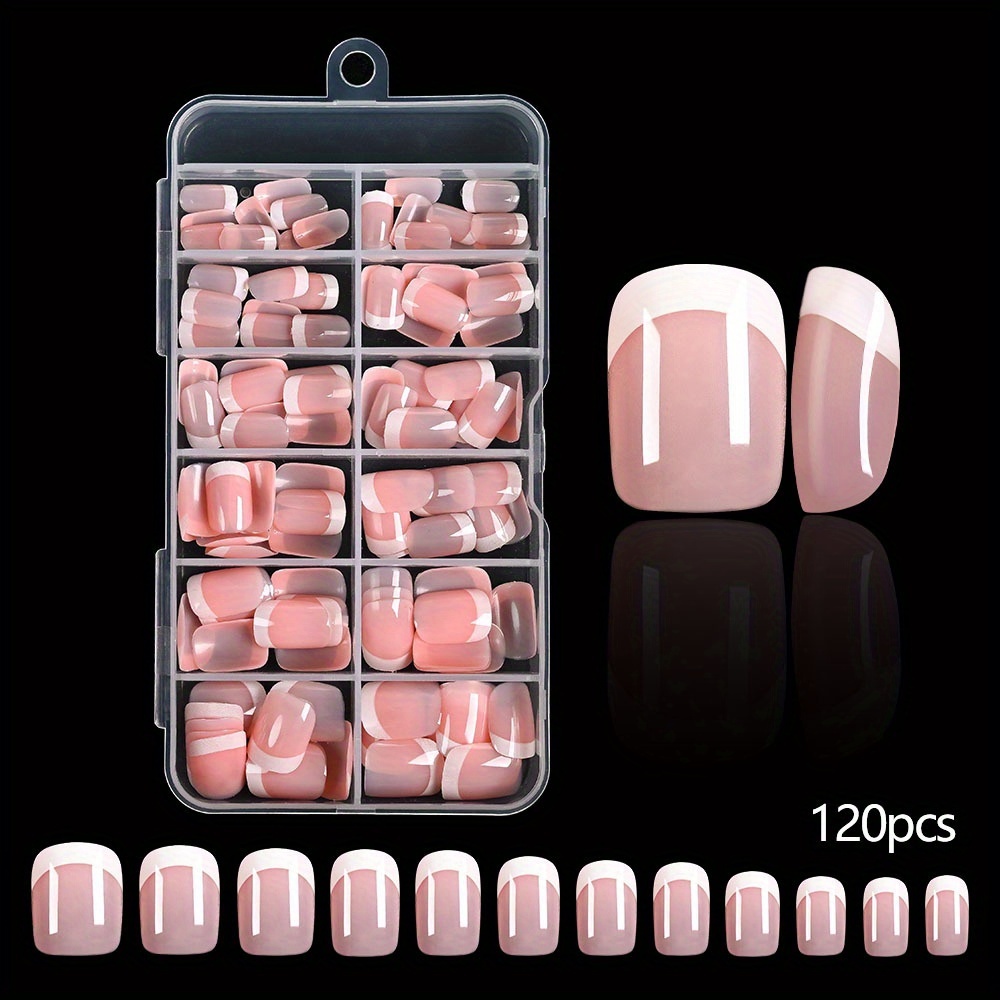 TEMU 12가지 다양한 사이즈의 핑크색 짧은 사각 인조 손톱 120개 세트. 풀 커버리지용 포장. 재사용 가능한 아크릴 프레스온 네일로 매니큐어, 일상 사용, 파티, 스타일리시한 룩에 이상적이며 여성, 네일 애호가를 위한 완벽한 선택입니다.