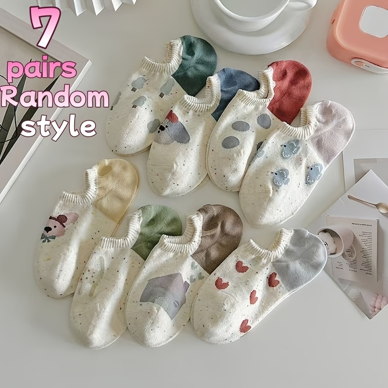 TEMU 7켤레 팩 여성용 한국 스타일 미끄럼방지 통기성 노쇼 양말 - 귀여운 힐 캐릭터 (하트, 동물, 얼굴) - 스니커즈용 발목 양말, 데일리 웨어