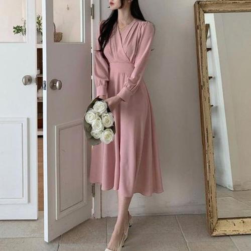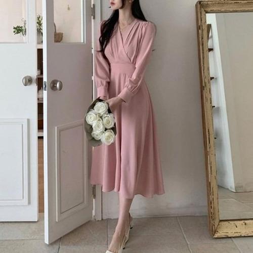 [다잇템_패션]여자 롱 백밴딩 랩 V넥 에이라인 귀여운 원피스