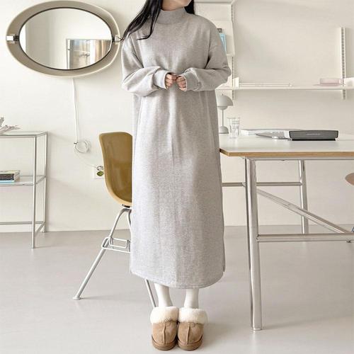 [문에이블]문에이블 여자 여성 겨울 루즈핏 빅사이즈 기모 반폴라 하이넥 데일리 기본 긴팔 롱 원피스