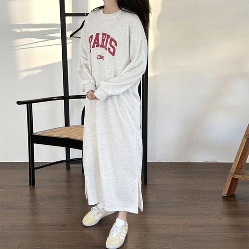 [문에이블]문에이블 여자 여성 가을 겨울 루즈핏 데일리 기본 영문 나염 기모 노기모 긴팔 롱 원피스
