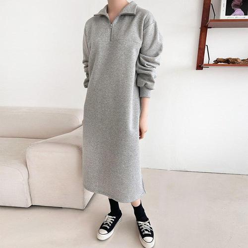[문에이블]문에이블 여자 여성 겨울 루즈핏 따뜻한 데일리룩 기본 무지 기모 반집업 긴팔 롱 원피스
