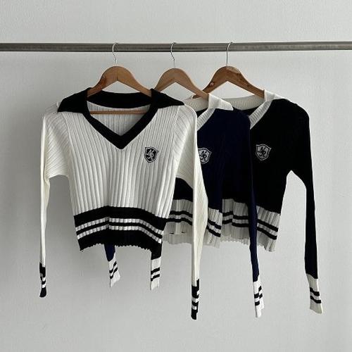 [다잇템][다잇템] 여자 슬림핏 골지긴팔 카라넥 V넥 콘트라스트 탱크 니트_23210185_588872