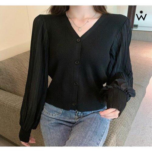 [위시드]페미닌 브이넥 슬림핏 퍼프 소매 니트 블라우스 (WIBABL003)
