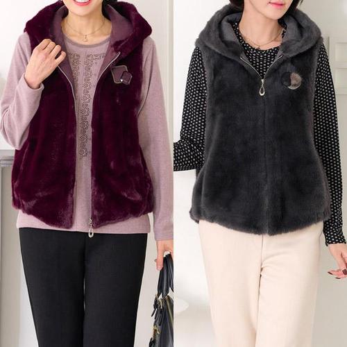 AOKADA 중년 여성 인조 모피 후드 퍼자켓 친환경모피 코트 하프코트