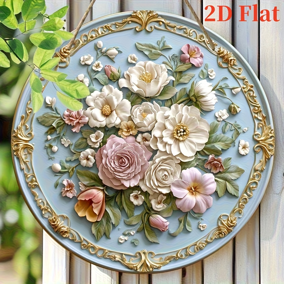 TEMU 2D 플랫 2D 플랫 꽃 벽 예술 - 우아한 둥근 나무 서명, 금색 프레임, 세부적인 장미와 백합 디자인, 집, 사무실, 또는 휴일 장식에 완벽, 축제적인 집 액센트 | 장식 벽 서명 | 세부적인 꽃 패턴, 벽 장식