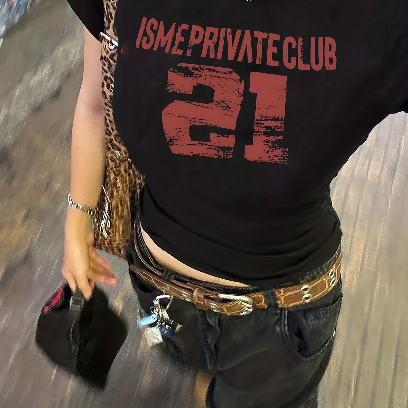TEMU 1개 여성용 Y2K 빈티지 ISMEPRIVATE 디지털 21 반팔 티셔츠 - 레트로 디스트레스드 프린트 라운드넥 크롭탑, 넘버 21 디자인, 2000년대 에스테틱 캐주얼 웨어