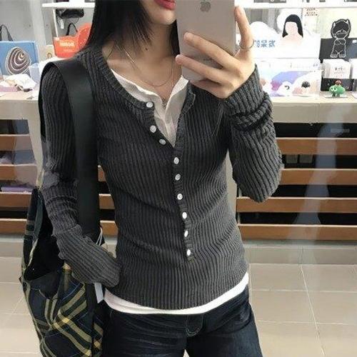 [모로엠]3컬러 투버튼 헨리넥 긴팔 니트티셔츠 HIT-TSA-Q009