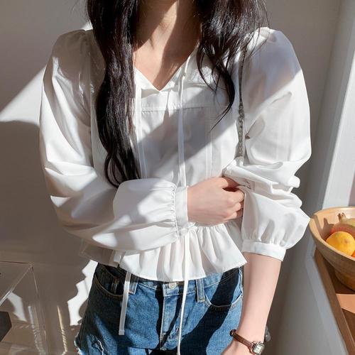 블라우스 여성 쉬폰 셔츠 여름 반팔 화이트 상의 베라노 레이스 브이넥 F452